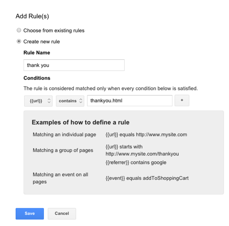 A rule is a condition that is necessary to launch or block a tag. For instance, you would use “only links that do not contain yoursite.com” to launch a tag for clicks on external links.