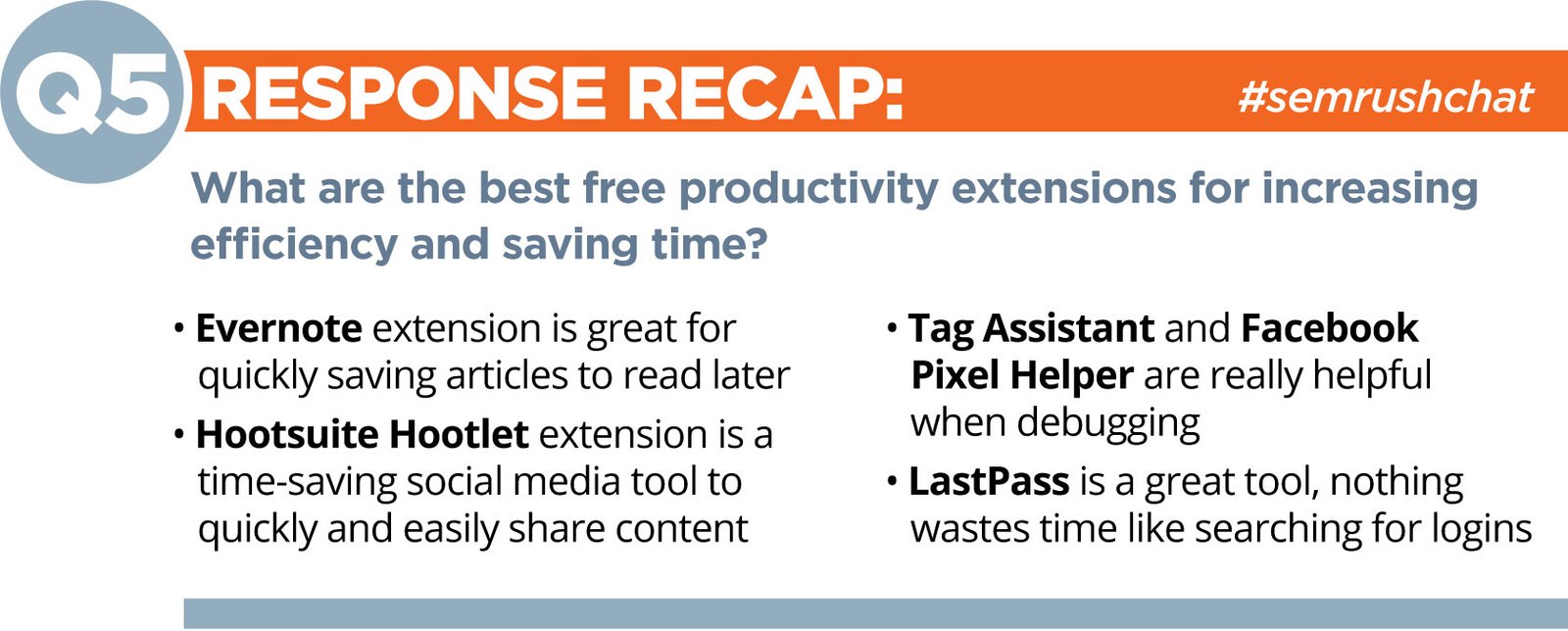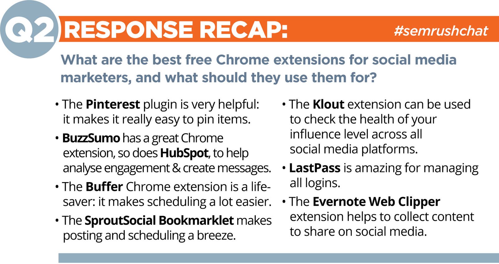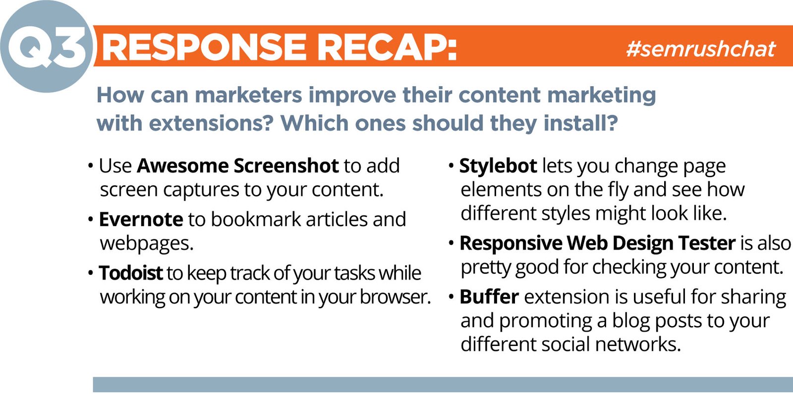 A1: Our social & content folks use about 6-8 extensions each, depending on the day & the project. #semrushchat