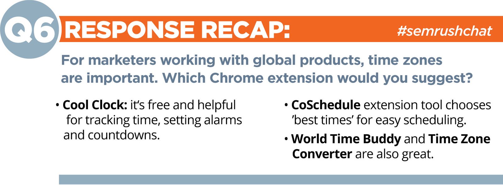 Q6: For marketers working with global products, time zones are important. Which Chrome extension would you suggest?