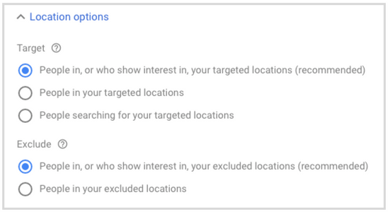 Google Ads offers a range of excellent options to suit your specific business goals. You can target users by location according to various criteria: