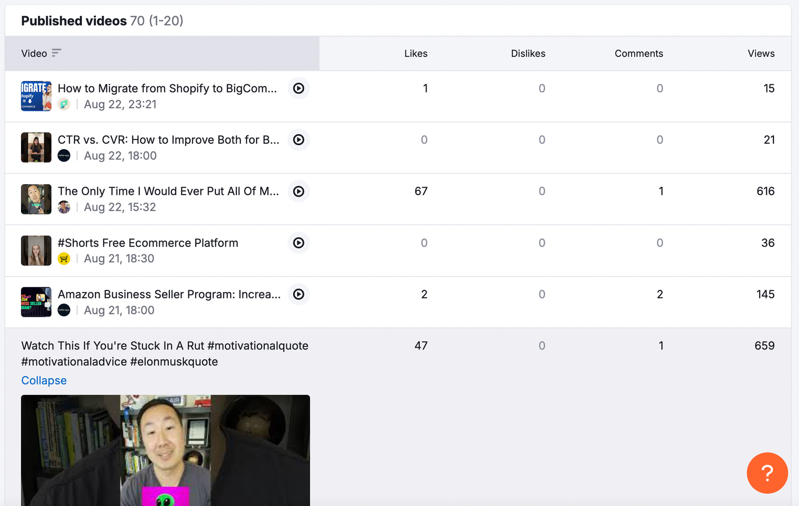 Here you’ll see the ranking, thumbnail, duration, title, and publish date for the top 20 videos.