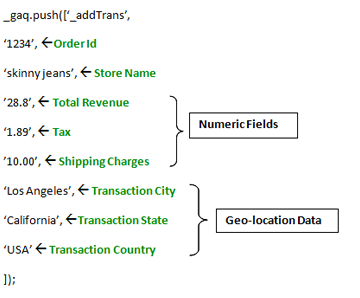 Syntax: _addTrans(orderID, store name, total revenue, tax, shipping, city, state, country)