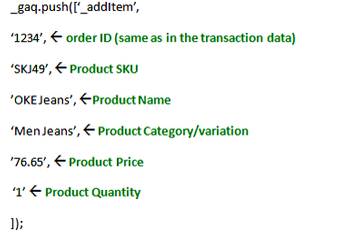 Syntax: _addItem(orderID, Product-SKU, Product-Name, Product-Category, Product-Price, Quantity)