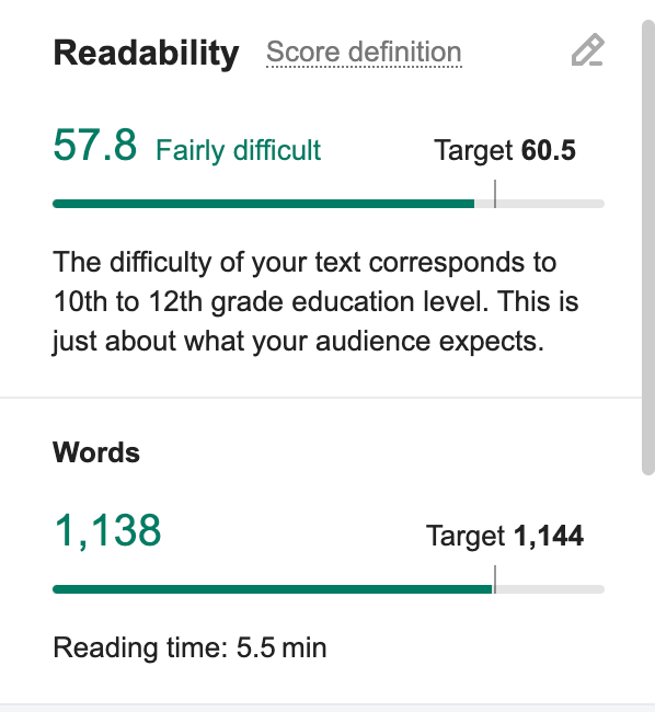 - Click on the ‘Readability’ button. Check the target readability for your article and compare the figure to your current readability. The higher the score, the easier the language should be. Click on the ‘Score definition’ to learn how the score works.