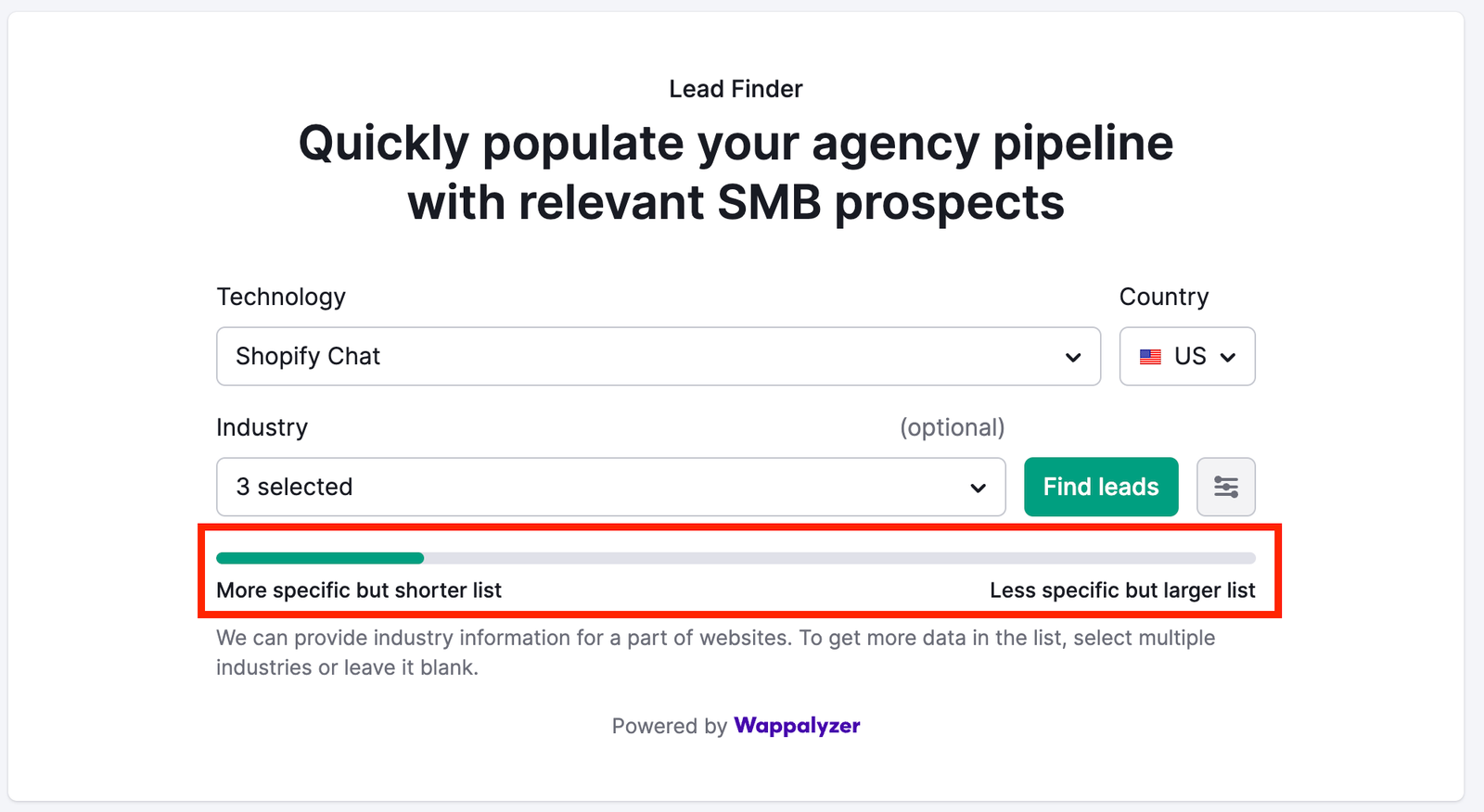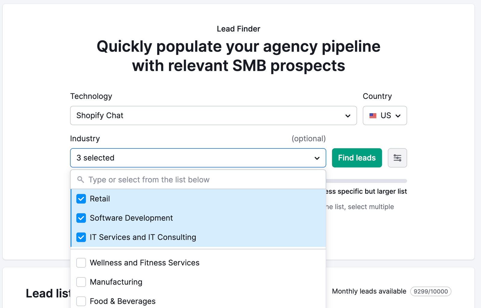 Lead Finder helps digital agencies and marketers quickly find relevant business leads based on their location and the web technologies those leads use.