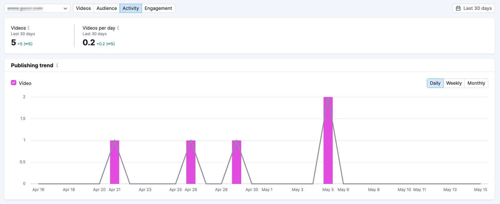 To compare each competitor’s posting, navigate to the Activity tab and check the Publishing graph. You can switch between competitors using the Company filter. This graph shows how many videos a channel publishes on YouTube on a daily basis.